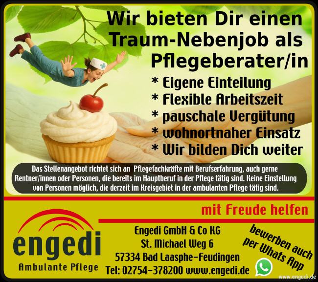 Im Rahmen des Pflegeberatungsbesuchs nach §37,3 erstellst Du gemeinsam mit unserem Kunden den Pflegeberatungsbesuchsnachweis für die Pflegekasse. Du schätzt dabei professionell die Pflegesituation und Pflegerisiken ein und gibst praktische Tips zur Verbesserung der Pflegesituation z.B. durch Beratung zum Einsatz von Pflegehilfsmittel oder Pflegetechniken. Prophylaxen zum Wohle des Patienten aber auch des pflegenden Angehörigen spielen dabei eine zentrale Rolle. Ausserdem erläuterst Du im Beratungseinsatz die Leistungen der Pflegeversicherung und unterstützt ggf. bei der Antragsstellung dieser Leistungen. Du berätst Anbieterneutral und führt kein Verkaufsgespräch. Natürlich wirst Du eingearbeitet und geschult, bevor Du selbst Beratungen durchführst. Anstellung im Berech Minijob (bis 603 Euro monatlich) |