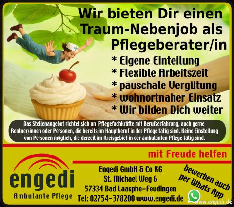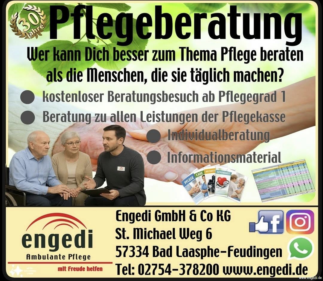 Im Rahmen des Pflegeberatungsbesuchs nach §37,3 erstellst Du gemeinsam mit unserem Kunden den Pflegeberatungsbesuchsnachweis für die Pflegekasse. Du schätzt dabei professionell die Pflegesituation und Pflegerisiken ein und gibst praktische Tips zur Verbesserung der Pflegesituation z.B. durch Beratung zum Einsatz von Pflegehilfsmittel oder Pflegetechniken. Prophylaxen zum Wohle des Patienten aber auch des pflegenden Angehörigen spielen dabei eine zentrale Rolle. Ausserdem erläuterst Du im Beratungseinsatz die Leistungen der Pflegeversicherung und unterstützt ggf. bei der Antragsstellung dieser Leistungen. Du berätst Anbieterneutral und führt kein Verkaufsgespräch. Natürlich wirst Du eingearbeitet und geschult, bevor Du selbst Beratungen durchführst. Anstellung im Berech Minijob (bis 603 Euro monatlich)